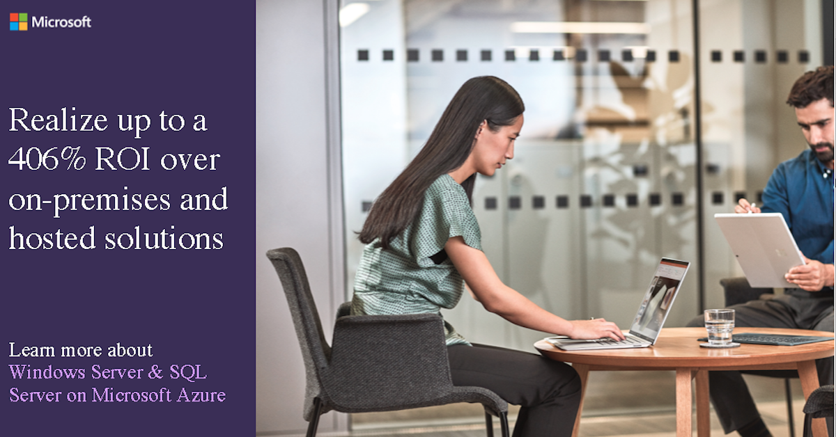 Your server workloads are better together on Azure. Realize up to a ROI by up to 406% ROI over on-premises and hosted solutions @MicrosoftAzure for your Windows Server and SQL Server workloads. Subscribe now!